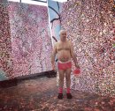 La photo le représente en petite tenue rose. Le gagnant recevra un édition numérotée d'une de ses toiles. |